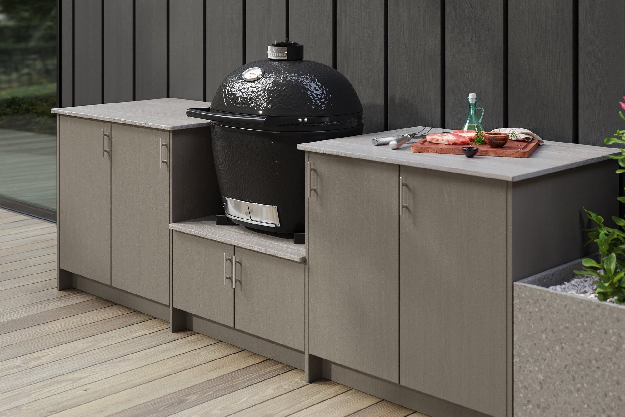 JDM offers a standard 82" grill island by Agora Outdoor Cabinetry, designed with Delta Heat grills in mind. Cabinets are crafted from Marine Grade Poly (MGP), which is typically used in commercial and marine applications, making this a quality and versatile material for outdoor kitchen components. Unlike more permanent outdoor islands, made from materials such as stone and concrete, islands made from MGP can be moved if ever the need arises. Available in both natural gas (NG) and propane (LP) configurations, this island makes it easy to bring meal prep and entertaining to the great outdoors.